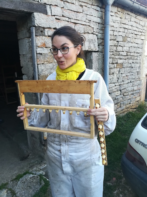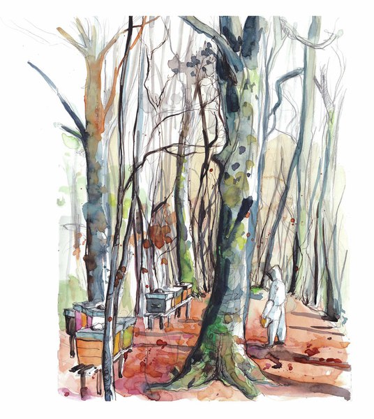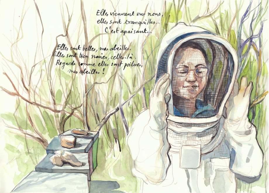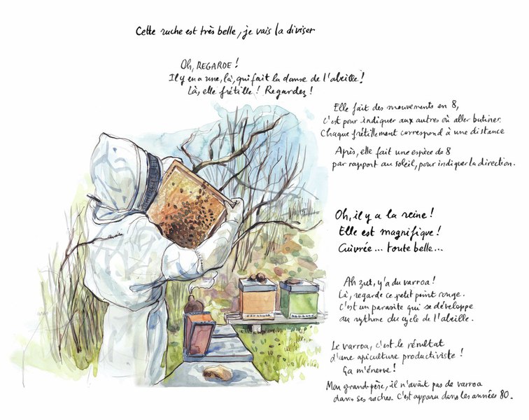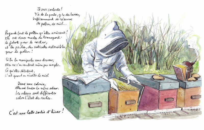 Reportage dessiné sur Cécile Chanal Raffier, apicultrice en Haute-Marne. Réalisation, dessins et légendes de Geneviève Marot,